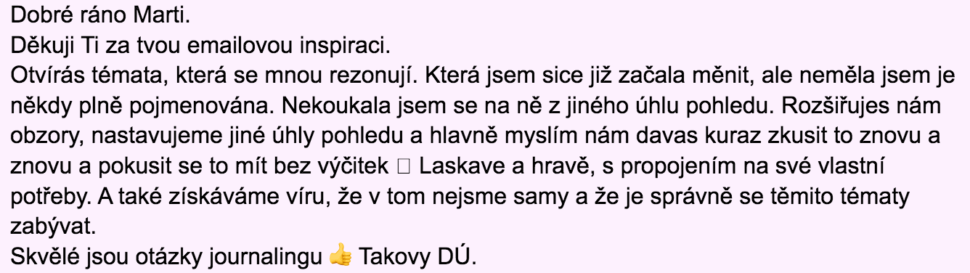 Díky Marti. Mezi tou záplavou emailů tvé maily čtu ráda a vždy si je projdu. Kolikrát mi hodně pomohly a téma se mnou často velmi rezonuje. Děkuji ti za to.